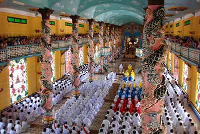 W takich warunkach rozwinął się kaodaizm (od imienia najwyższej istoty Cao Dai) - religia wietnamska, której światowa stolica znajduje się w 150-tysięcznej miejscowości Tay Ninh niedaleko granicy z Kambodżą. Jego wyznawcy uważają go za kolejny, wyższy poziom religijnych monoteistycznych systemów zachodnich, a za swój symbol przyjęli boskie oko wpisane w trójkąt. W rzeczywistości to połączenie elementów buddyzmu, taoizmu, konfucjanizmu, chrześcijaństwa, różnych filozofii świeckich oraz w niewielkim wymiarze islamu i judaizmu. Wnętrze głównej świątyni kaodaizmu w Tay Ninh jest niezmiernie kolorowe. Zdobią je zarówno kwiat lotosu, azjatyckie smoki, oko opatrzności, jak i rzeźba Chrystusa. Turyści mogą wziąć udział w barwnej ceremonii religijnej odbywającej się 4 razy dziennie, podczas której wierni noszą białe jednakowe szaty, a kapłani w zależności od hierarchii - stroje żółte, czerwone i niebieskie.
