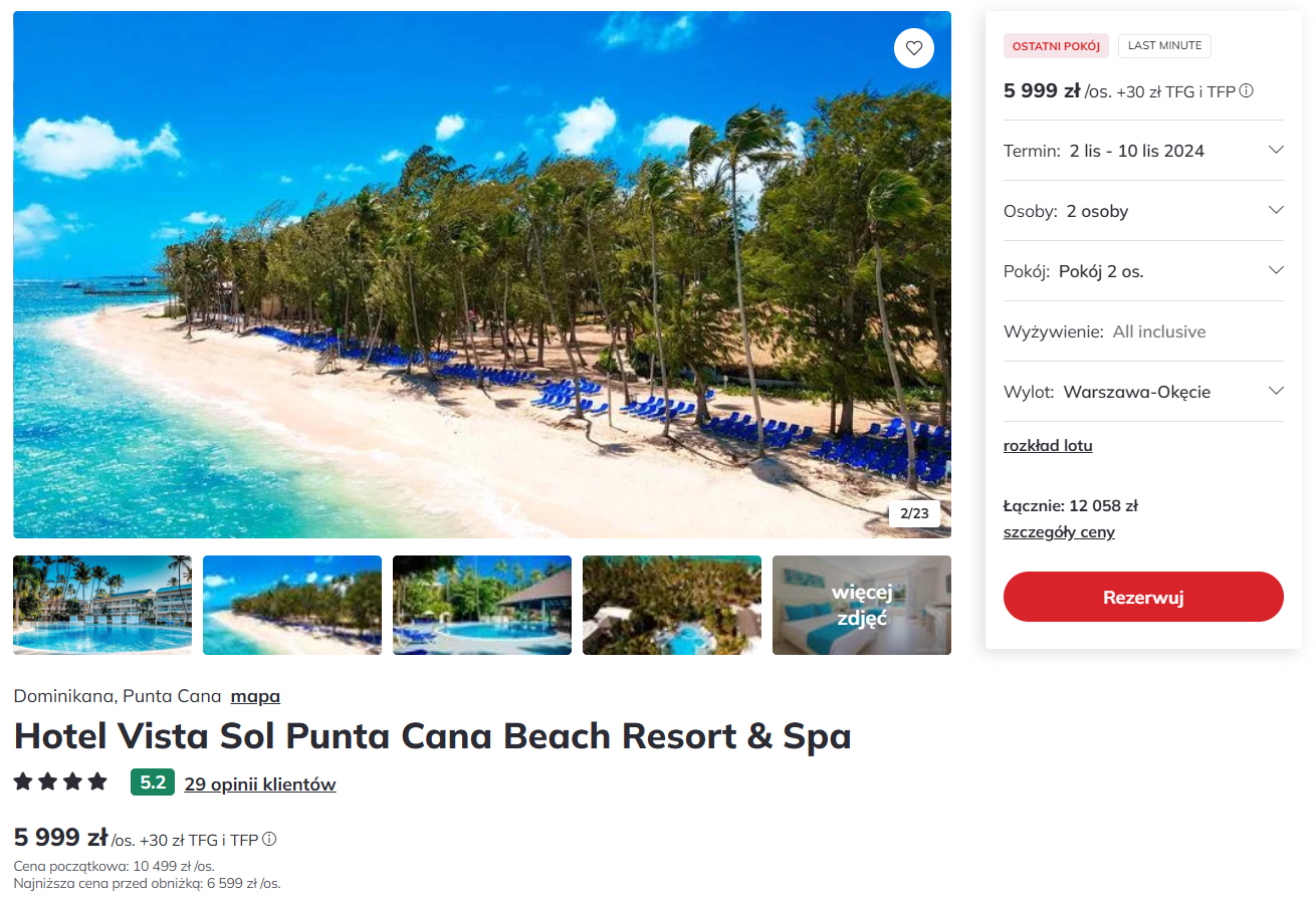 Spędźcie egzotyczne wakacje na Dominikanie. Odpoczniecie w bardzo dobrym (ocena 5.2/6), położonym tuż przy plaży, 4* hotelu Vista Sol Punta Cana Beach Resort & Spa z wyżywieniem All inclusive. Hotel oferuje m.in.: 3 baseny, atrakcje dla dzieci, animacje, przedstawienia i występy muzyczne na żywo, zajęcia sportowe, 6 restauracji, 7 barów.