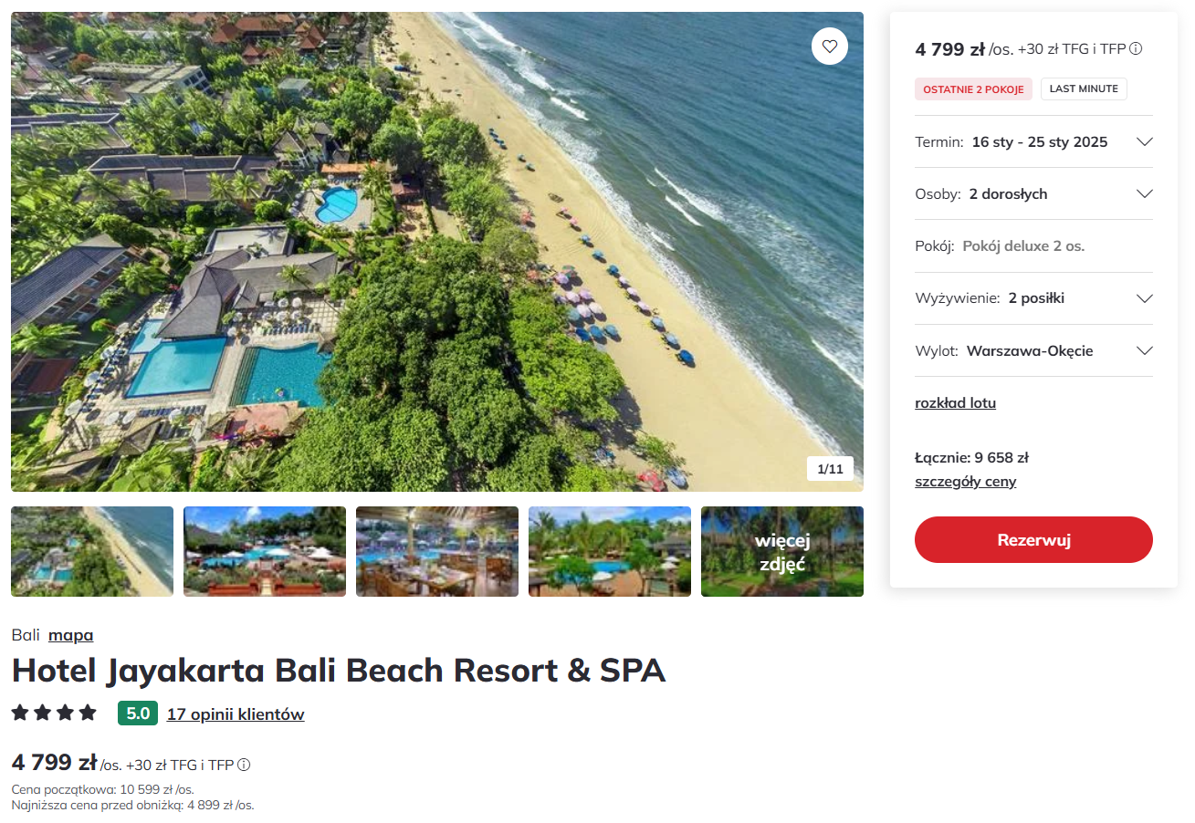 Goście cenią hotel Jayakarta Bali Beach Resort & SPA za świetną lokalizację przy plaży Legian, która słynie z pięknych zachodów słońca i idealnych warunków do surfowania. Hotel oferuje komfortowe pokoje, różnorodne posiłki w ramach wyżywienia, a także przestronne ogrody tropikalne z basenami, które zapewniają doskonały relaks. Na miejscu dostępne jest także centrum spa, zajęcia sportowe i animacje, co sprawia, że obiekt jest idealny zarówno dla rodzin, jak i par szukających egzotycznego wypoczynku na Bali.