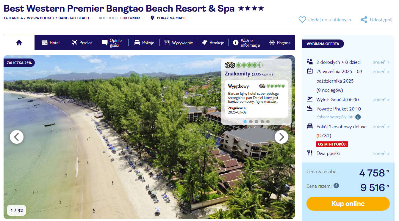 Goście chwalą hotel Best Western Premier Bangtao Beach Resort & Spa za jego doskonałą lokalizację tuż przy jednej z najpiękniejszych plaż na Phuket – Bangtao Beach. Szeroka, piaszczysta plaża z turkusową wodą zapewnia idealne warunki do relaksu, a bezpośrednie położenie hotelu przy brzegu umożliwia gościom szybki dostęp do morza. Na terenie hotelu znajdują się duże baseny otoczone tropikalnym ogrodem oraz brodzik dla dzieci. Goście podkreślają, że baseny są dobrze utrzymane, a dzięki dużej przestrzeni można znaleźć spokojne miejsce do odpoczynku. W ramach aktywności hotel oferuje siłownię, masaże w spa oraz programy animacyjne, które umilają pobyt zarówno dorosłym, jak i najmłodszym gościom.