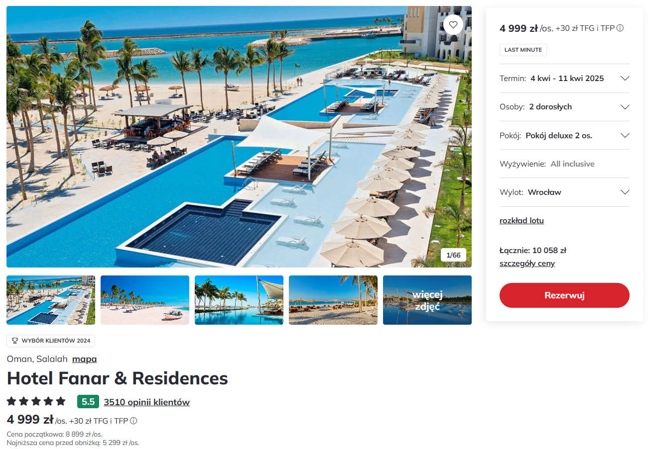 Bardzo dobra cena na egzotyczne wakacje, spędzicie je w Omanie w luksusowym, świetnie ocenianym (4.5/5 w serwisie Tripadisor), położonym przy 3 egzotycznych plażach, 5* hotelu Fanar & Residences z All inclusive. Hotel oferuje m.in.: 5 basenów (w tym 2 z jacuzzi), brodzik dla dzieci, animacje dla dzieci i dorosłych, dostęp do aqua parku, zajęcia sportowe, 4 restauracje, 7 barów.