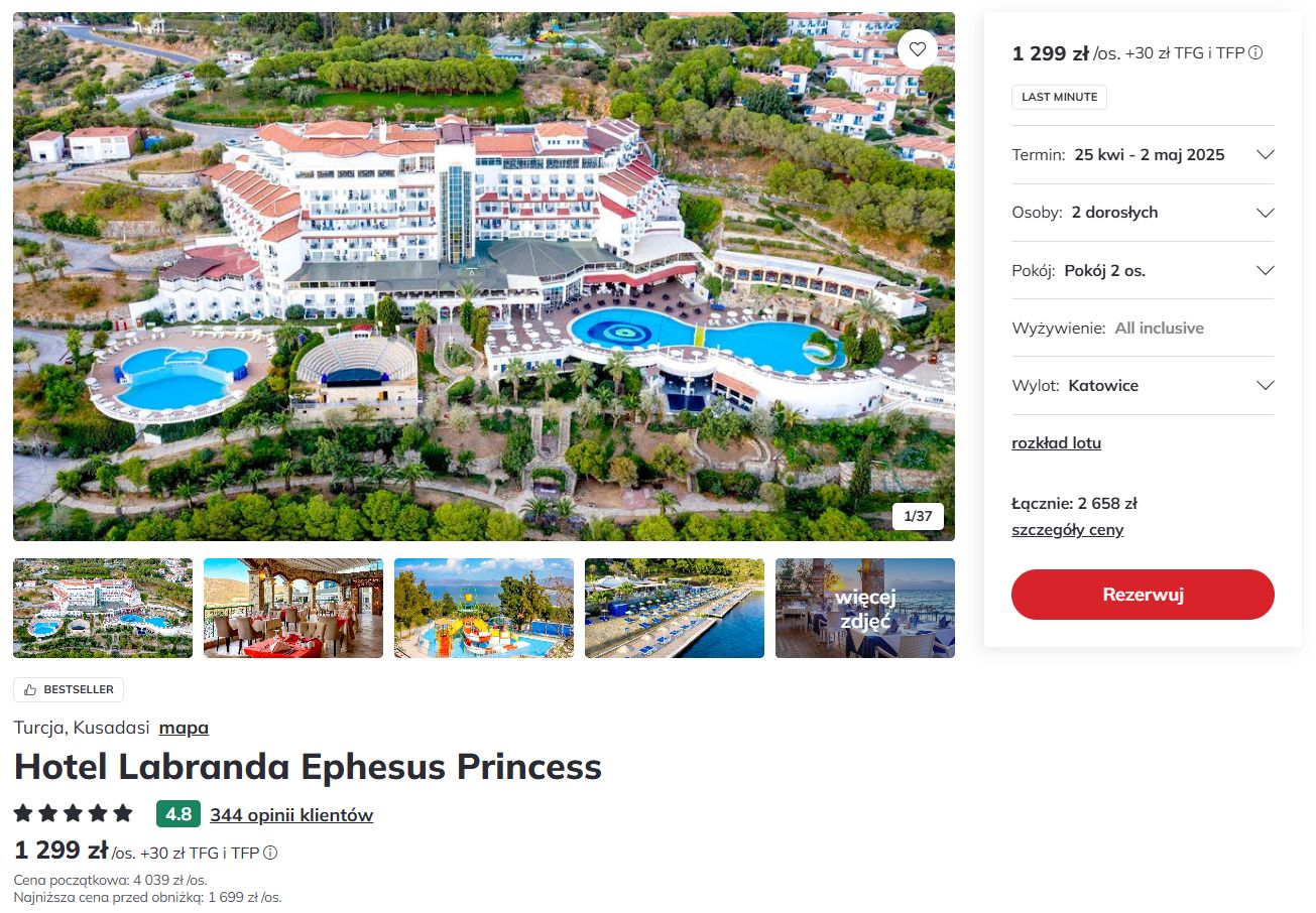Podsumowując, Labranda Ephesus Princess to hotel, który łączy dobre położenie, atrakcyjny teren, bogate zaplecze rekreacyjne i przystępną cenę. Choć niektóre elementy – jak część pokoi czy wyżywienie – mogłyby zostać zmodernizowane, ogólny poziom usług i atmosfera sprawiają, że hotel cieszy się dużą popularnością. To miejsce polecane zarówno rodzinom z dziećmi, jak i parom oraz grupom przyjaciół, którzy szukają wypoczynku w formule All Inclusive nad pięknym Morzem Egejskim, z możliwością odkrywania bogatej historii regionu.