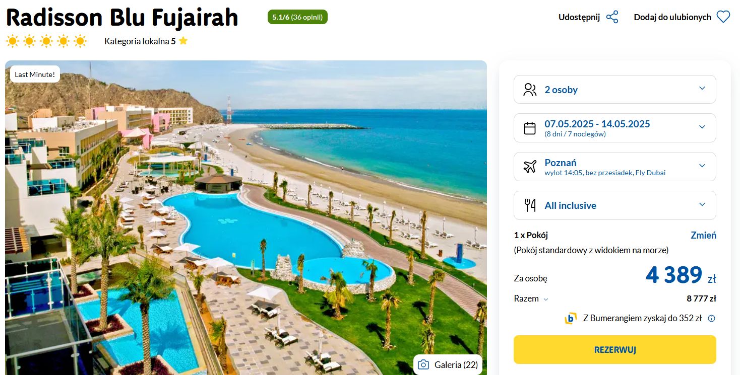 Wakacje w Emiratach Arabskich w wersji luksusowej, odpoczniecie w bardzo dobrym 5* hotelu Radisson Blu Fujairah z wyżywieniem All inclusive. Hotel oferuje m.in.: 5 basenów, brodzik dla dzieci, centrum fitness (siłownia, jacuzzi, łaźnia parowa), animacje, 2 restauracje, bar przy basenie.