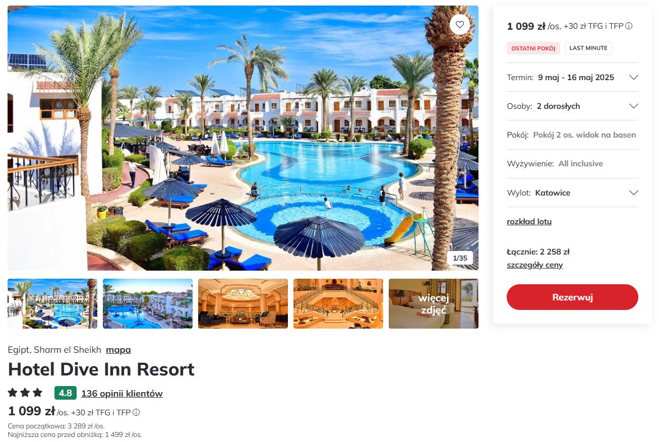 Fantastyczna cena na wakacje All inclusive w Egipcie, odpoczniecie w znakomitym (ocena aż 8,8/10 na Bookingu) 4* hotelu Dive Inn Resort w Sharm el Sheikh. Hotel oferuje m.in.: 2 baseny, występy muzyczne na żywo, zajęcia sportowe, restaurację, 3 bary.