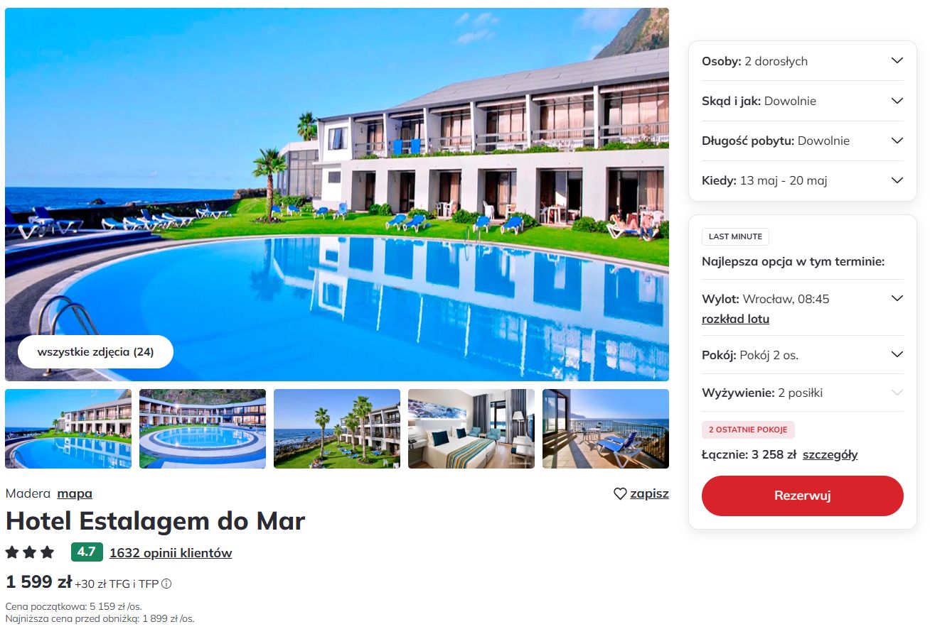 Spędźcie urlop na pięknej Maderze, odpoczniecie w bardzo dobrym (ocena w Google 4.2/5 i 8/10 na Bookingu) pięknie położonym hotelu Estalagem do Mar z wyżywieniem. Hotel leży zaledwie 10 metrów od plaży, oferuje m.in.: 2 baseny (jeden kryty), jacuzzi, saunę, bilard, rzutki, restaurację, 2 bary.