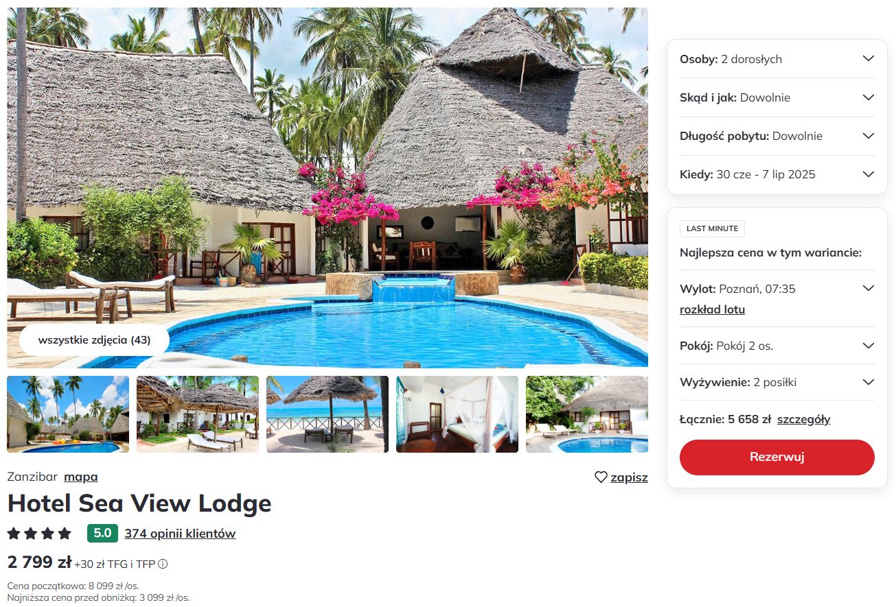 Bardzo interesująca cena wakacji na Zanzibarze, odpoczniecie w polecanym (nota 8,5/10 na Bookingu), położonym tuż przy plaży, kameralnym 4* hotelu Hotel Sea View Lodge z wyżywieniem. Hotel oferuje m.in.: basen, bezpłatne Wi-Fi, taras z widokiem na ocean, restaurację, bar na plaży.