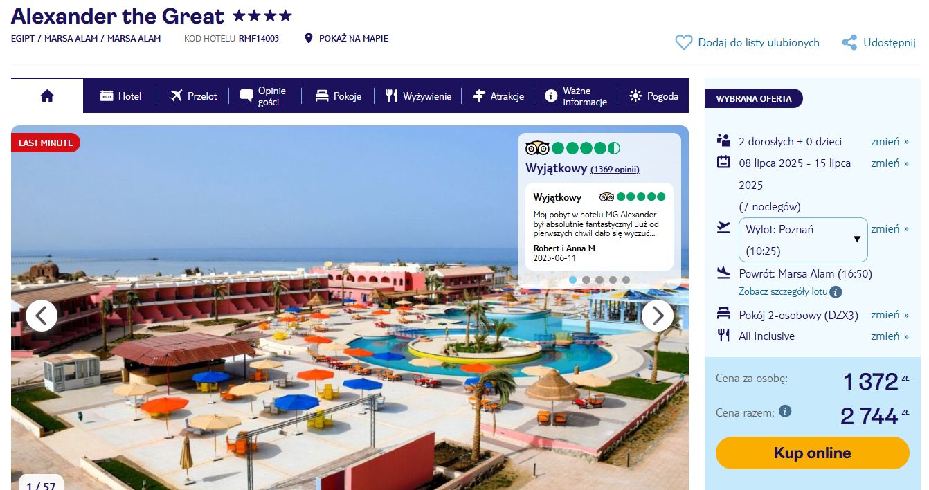 Bardzo ciekawa propozycja cenowa na wakacje w egipskim kurorcie Marsa Alam, odpoczniecie w polecanym (ocena 4,5/5 w serwisie Tripadvisor), położonym przy plaży 4* hotelu MG Alexander The Great z wyżywieniem All inclusive. Hotel przeszedł remont w 2022 roku, oferuje m.in. 3 baseny, zjeżdżalnie wodne, animacje dla dzieci i dorosłych, dyskotekę, 3 restauracje, 4 bary.
