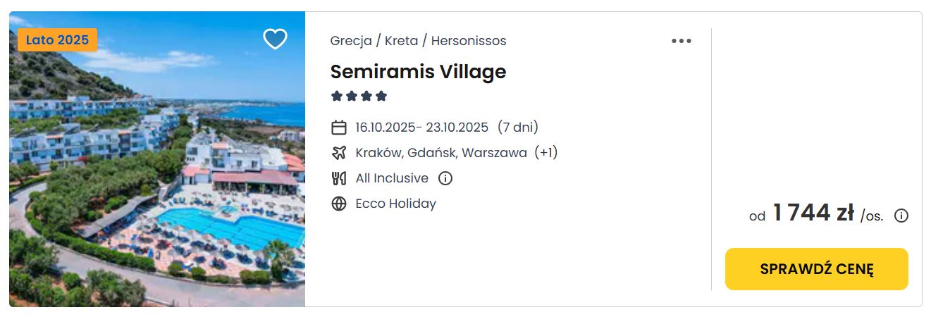Ciekawa propozycja cenowa na wakacje na Krecie, odpoczniecie w 4* hotelu Semiramis z wyżywieniem All inclusive. Hotel oferuje m.in.: basen, jacuzzi, siłownię, kort tenisowy, oprawę rozrywkową, dostęp do Wi-Fi, restaurację, kawiarnię, bar.