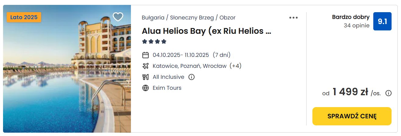 Bardzo dobra cena na tydzień wakacji w Bułgarii. Odpoczniesz w świetnie ocenianym (ocena aż 8,9/10 na Bookingu), położonym przy piaszczystej plaży, 4* hotelu Alua Helios Bay z wyżywieniem All inclusive. Hotel oferuje m.in.: 2 baseny (w tym kryty), brodzik dla dzieci, animacje, występy muzyczne na żywo, saunę, łaźnię, atrakcje dla dzieci, 3 restauracje, 4 bary.