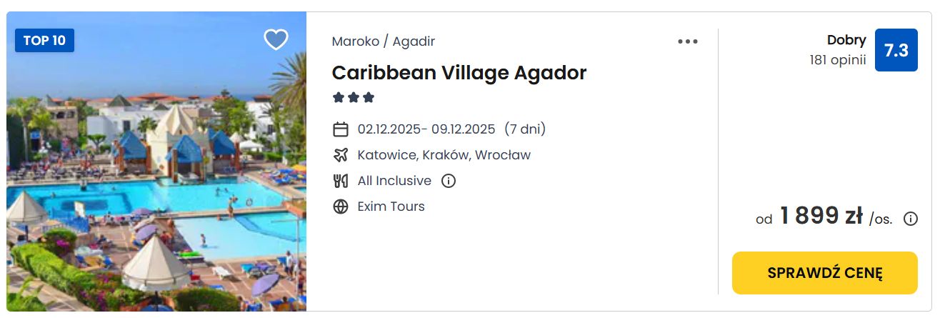Bardzo dobra cena na tygodniowe wakacje All inclusive w Maroku, odpoczniesz w położonym blisko prywatnej plaży 3* hotelu 3* hotelu Caribbean Village Agador. Hotel oferuje m.in: 4 baseny (w tym 2 podgrzewane), animacje, wieczorne przedstawienia, dyskotekę, 4 restauracje, 4 bary.