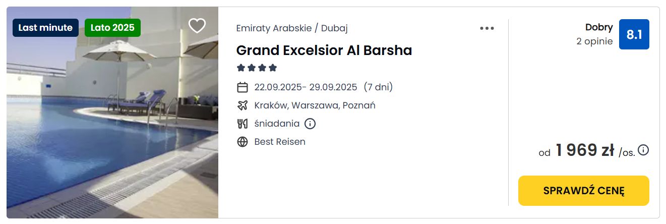 Ciekawa propozycja cenowa na tydzień wakacji w Dubaju, odpoczniecie w bardzo dobrze ocenianym (8,4/10 na Booking.com) nowoczesnym 4* hotelu Grand Excelsior Al Barsha ze śniadaniami. Hotel oferuje m.in.: basen, taras słoneczny, saunę, łaźnię, bezpłatne Wi-Fi.