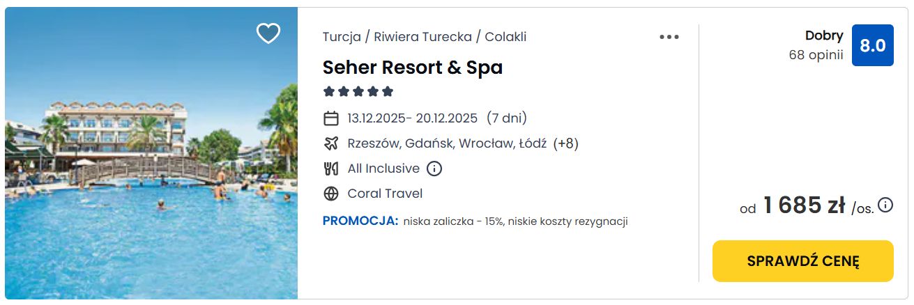 Ciekawa propozycja na tygodniowe wakacje All inclusive w Turcji bez tłumów, odpoczniesz w dobrze ocenianym 5* hotelu Seher Resort & Spa z All inclusive. Hotel oferuje m.in.: prywatną plażę, 4 baseny (w tym podgrzewany), aqua park, animacje, występy muzyczne na żywo, 3 restauracje, 4 bary. Wycieczka dostępna z Poznania, Warszawy, Katowic, Gdańska i Poznania. Do wyboru jest kilka terminów. Ocena gości: 8/10 na Wakacje.pl.