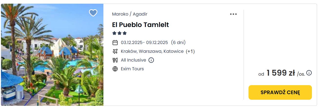 Goście chwalą 3* hotel El Pueblo Tamlelt w Maroku za jego doskonałą lokalizację w samym sercu Agadiru, jednego z najpopularniejszych kurortów w Maroku, zaledwie kilka minut spacerem od szerokiej, piaszczystej plaży. Obiekt położony jest w rozległym, zielonym ogrodzie, co tworzy przyjemną, wakacyjną atmosferę. Goście podkreślają marokański klimat kompleksu, przyjazną obsługę, czystość oraz spokojne otoczenie, a także dogodny dostęp do nadmorskiej promenady i atrakcji miasta.