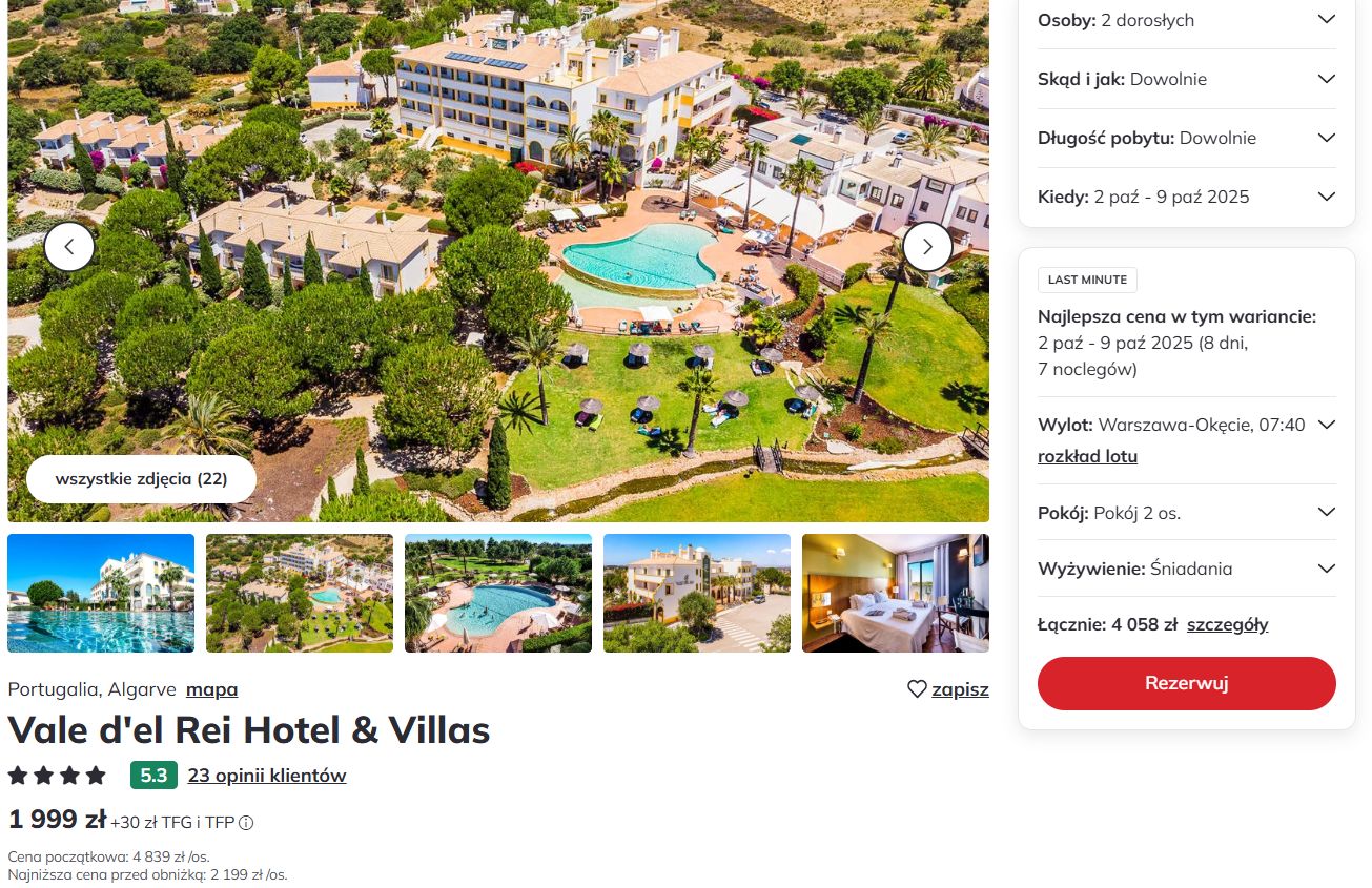 Podsumowując, hotel Vale d’el Rei Hotel & Villas to elegancki i kameralny obiekt w sercu Algarve, idealny dla osób szukających relaksu w otoczeniu natury. Goście doceniają spokojną lokalizację, wysoki standard usług, smaczne śniadania i bliskość jednych z najpiękniejszych plaż Portugalii. Niektórzy wspominają, że brak formuły All inclusive wymaga planowania posiłków poza hotelem, jednak dla wielu to atut sprzyjający poznawaniu lokalnej kuchni. To doskonały wybór na stylowe i malownicze wakacje w Portugalii.