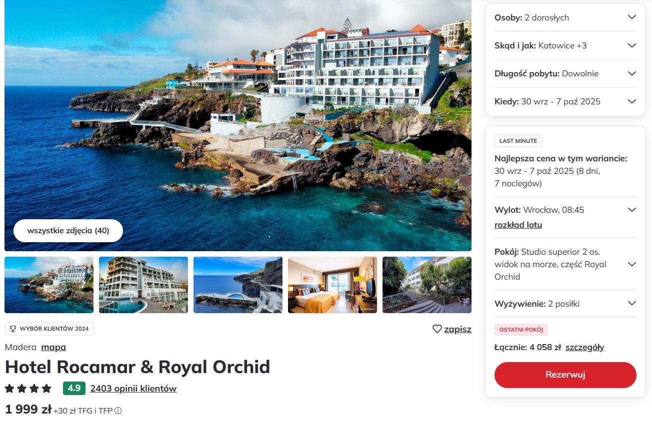 Ciekawa propozycja na wypoczynek na wiecznie zielonej Maderze w Portugalii, tydzień wakacji spędzisz w położonym nad oceanem, bardzo dobrze ocenianym przez gości 4* hotelu Rocamar & Royal Orchid z wyżywieniem HB (śniadania i obiadokolacje). Hotel oferuje m.in.: 3 baseny (w tym jeden naturalny ze słoną wodą i jeden kryty), jacuzzi, saunę, bezpłatne Wi-Fi, restaurację, bar. W cenie kompletna wycieczka z dużym bagażem rejestrowanym. Ocena gości: 8,6/10 na Booking.com.