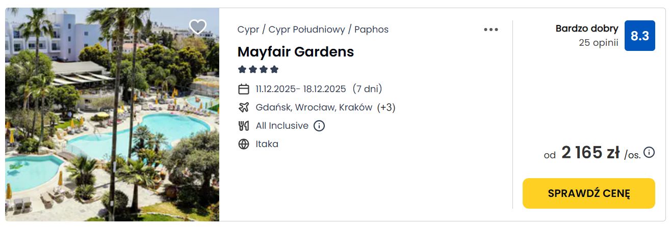 Podsumowując, hotel Mayfair Gardens to nowoczesny i rodzinny obiekt oferujący 3 baseny, bogaty program rekreacyjny i smaczną kuchnię w formule All inclusive. Goście cenią jego spokojną lokalizację, wygodny dostęp do plaży i możliwość korzystania z infrastruktury siostrzanego hotelu Mayfair Hotel, choć niektórzy wspominają, że część atrakcji działa sezonowo. To świetny wybór na komfortowe i słoneczne wakacje na Cyprze.