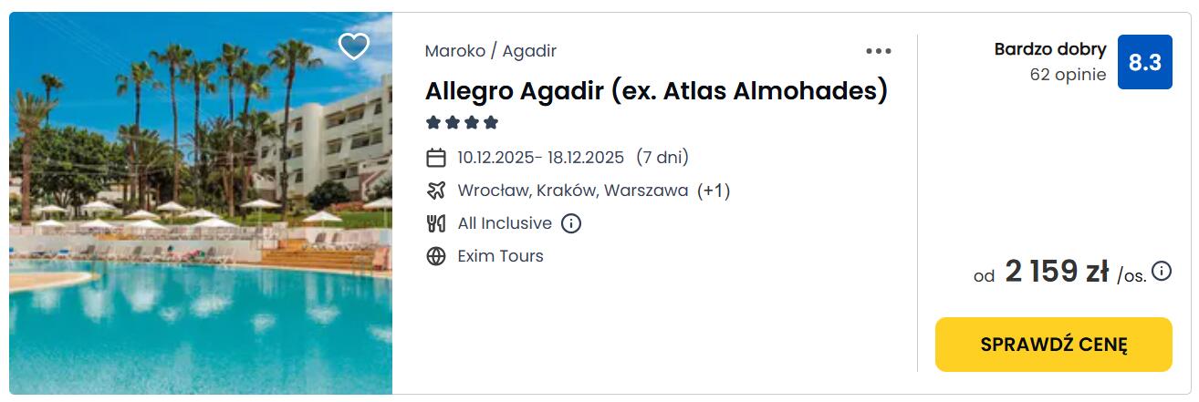 Bardzo ciekawy naszym zdaniem kierunek na słoneczne wakacje, tydzień urlopu spędzicie w dobrze ocenianym, położonym blisko piaszczystej plaży w Agadirze 4* hotelu Allegro Agadir z All inclusive. W hotelu znajdziecie między innymi: 2 baseny (w tym brodzik), animacje dla dzieci i dorosłych, gry i zabawy, restaurację, 2 bary (w tym przy basenie), bezpłatne Wi-Fi. Wycieczka dostępna jest z Krakowa, Wrocławia, Berlina, Katowic i Warszawy. Ocena gości 8,3/10 na Wakacje.pl i 4,5/5 na Google.com.