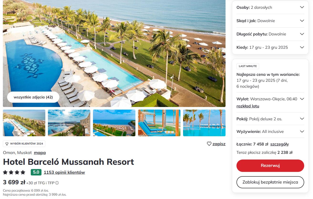 Odpocznij w egzotycznym Omanie w ciekawej naszym zdaniem cenie, tydzień wakacji spędzisz w polecanym, położonym przy przy piaszczystej plaży 4* hotelu Barcelo Mussanah Resort z All inclusive. W hotelu znajdziesz m.in.: 4 baseny (w tym dwa typu infinity tuż przy plaży), aqua park, saunę, jacuzzi, 2 restauracje, 3 bary, kawiarnię. W cenie kompletna wycieczka. Ocena gości 4,5/5 w Google.com i 4,3/5 na Tripadvisor.com.