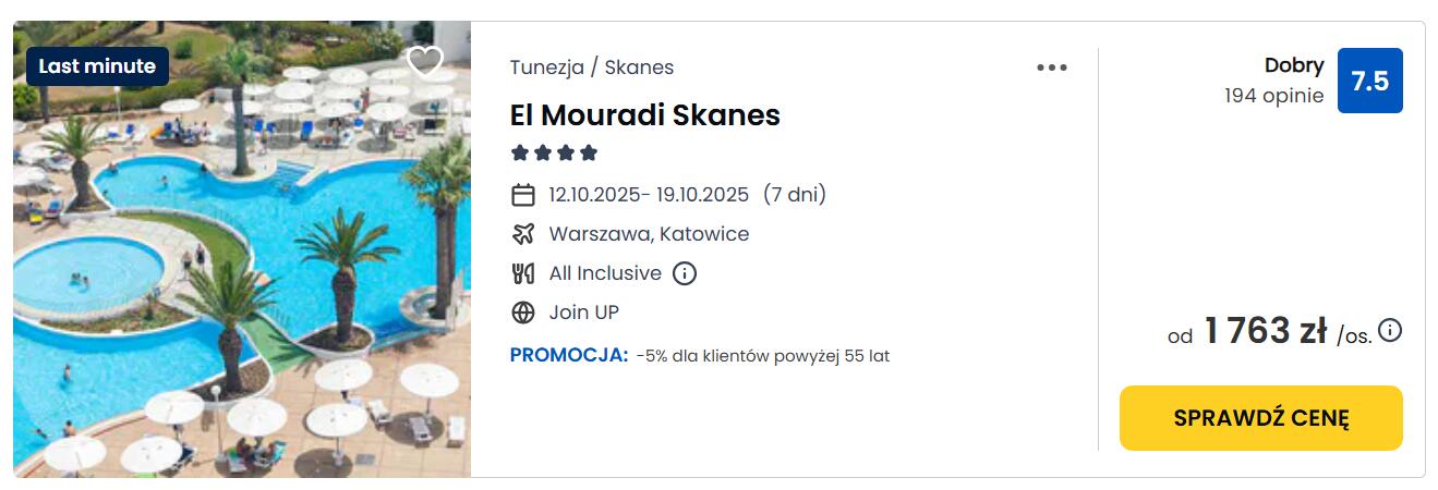 Odpocznij w Tunezji w położonym w przy plaży w 4* hotelu El Mouradi Skanes z All inclusive. Hotel oferuje między innymi: 2 baseny zewnętrzne, zjeżdżalnie wodne, animacje, zajęcia sportowe, atrakcje dla dzieci, 2 restauracje, 3 bary. Ocena gości 7,5/10 na Wakacje.pl.
