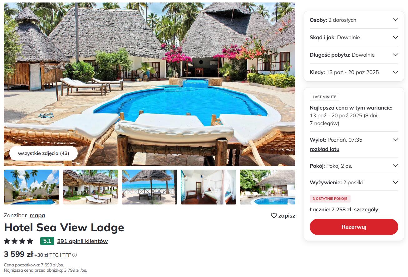 Egzotyczne plaże Zanzibaru czekają, tygodniowe wakacje spędzisz w bardzo dobrze ocenianym, kameralnym 4* hotelu Sea View Lodge z wyżywieniem HB (śniadania i obiadokolacje). Hotel dysponuje zaledwie 18 pokojami, znajdziesz w nim m.in.: basen, bezpłatne Wi-Fi, taras z widokiem na ocean, restaurację, bar na plaży. W cenie kompletna wycieczka. Ocena gości 8,2/10 na Booking.com i 4,2/5 na Tripadvisor.com.