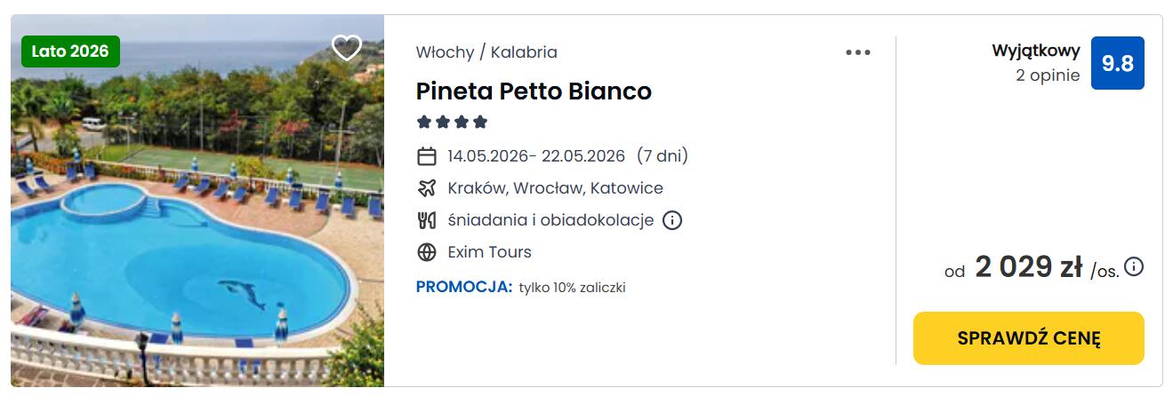Zaplanuj wypoczynek w malowniczej Kalabrii w dobrej naszym zdaniem cenie, odpoczniesz w polecanym (ocena 9,8/10 na Wakacje.pl i 4,3/5 na Tripadvisor.com) kameralnym 4* hotelu Pineta Petto Bianco z wyżywieniem HB (śniadania i obiadokolacje). Hotel oferuje m.in.: basen z brodzikiem dla dzieci, animacje, restaurację, bar, bezpłatny bus na plażę oddaloną 700 metrów od hotelu.
