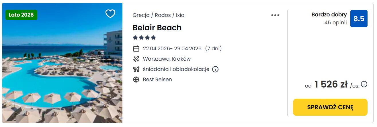 Zaplanuj wypoczynek na greckiej wyspie słońca - Rodos, tydzień urlopu spędzisz w bardzo dobrze ocenianym (8.5/10 na Wakacje.pl) 4* hotelu Belair Beach z wyżywieniem HB (śniadania i obiadokolacje). Hotel znajduje się 50 metrów od plaży w miejscowości Ixia, znajdziesz w nim m.in.: 2 baseny, animacje, występy muzyczne na żywo, bezpłatne Wi-Fi, restaurację, 2 bary.
