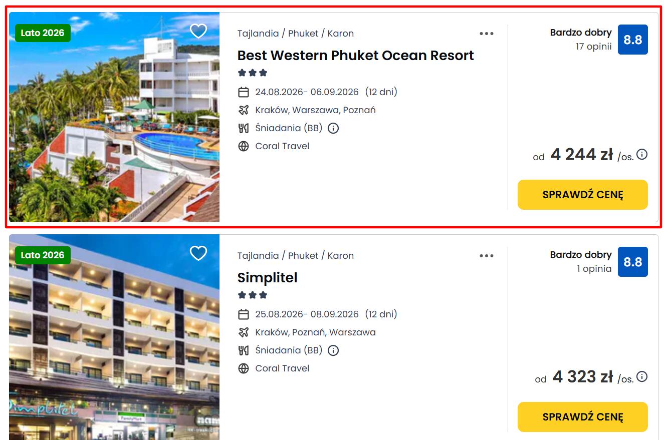 Odkryj uroki egzotycznej Tajlandii, dłuższe 12-dniowe wakacje spędzisz w bardzo dobrze ocenianym, położonym blisko plaży Karon na Phuket, 3* hotelu Best Western Phuket Ocean Resort ze śniadaniami (dostępne są także opcje HB i 3 posiłki). Hotel oferuje m.in.: 3 baseny, brodzik dla dzieci, bezpłatne Wi-Fi, restaurację, bar. W cenie wycieczka z dużym bagażem rejestrowanym. Ocena gości hotelu: 8,8/10 na Wakacje.pl i 8,5/10 na Booking.com.