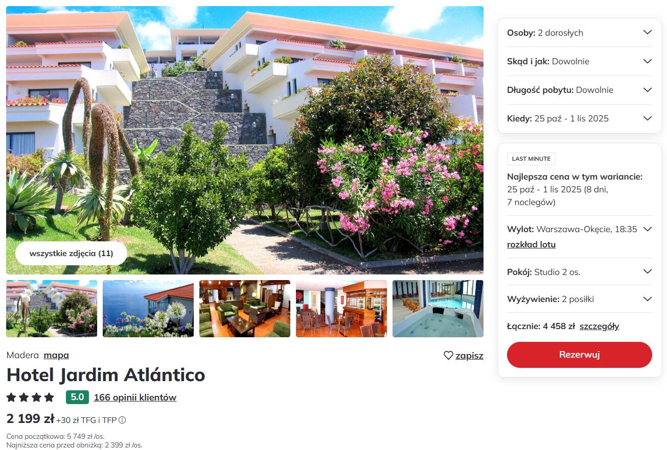Odkryj uroki wiecznie zielonej Madery, 7 dni wakacji spędzisz w oferującym zachwycający widok na ocean, położonym na zboczu klifu 4* hotelu Jardim Atlántico z wyżywieniem HB (śniadania i obiadokolacje). Hotel oferuje m.in.: 2 baseny, występy muzyczne na żywo, restaurację, 2 bary. Ocena gości hotelu: 8/10 na Booking.com i 4,3/5 na Google.com.