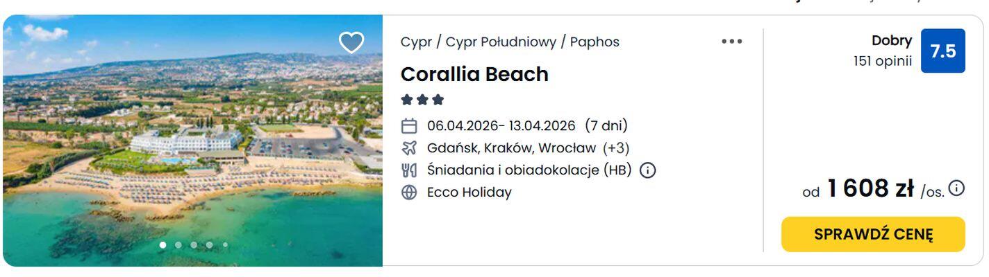 Ciekawa propozycja na tydzień urlopu na Cyprze, gdzie można idealnie połączyć wypoczynek ze zwiedzaniem. Odpoczniesz w położonym tuż przy plaży w miejscowości Pafos, 3* hotelu Corallia Beach z wyżywieniem HB (śniadania i obiadokolacje). Hotel oferuje m.in.: basen z brodzikiem, studio fitness, bilard, aerobik, restaurację, bar i kawiarnię. Goście oceniają hotel na 4,2/5 w Google.com i 7,5/10 na Wakacje.pl.