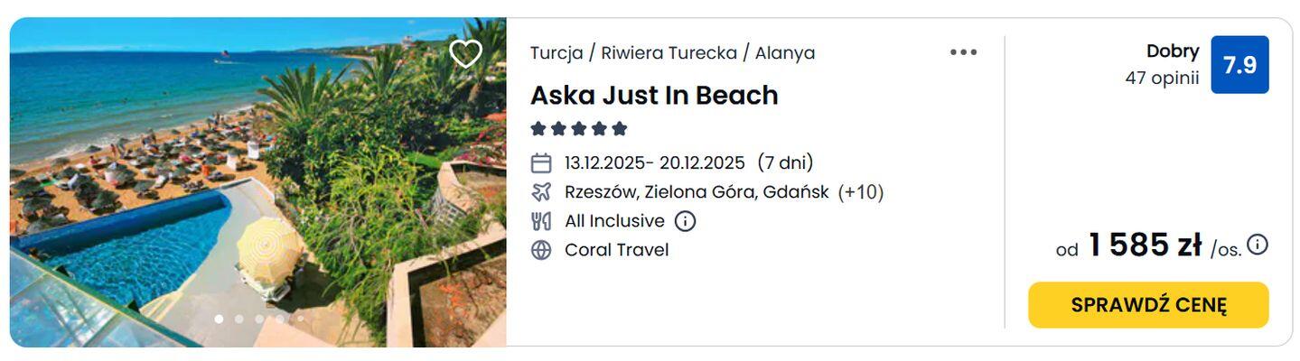 Ucieknij jesienią od codzienności na tureckie wybrzeże, tydzień urlopu spędzisz w polecanym przez gości, położonym tuż przy plaży z certyfikatem Błękitnej Flagi, 5* hotelu Aska Just in Beach z All inclusive. W hotelu znajdziesz m.in.: 3 baseny (w tym basen kryty), saunę, animacje, atrakcje dla dzieci (plac zabaw, mini klub, mini disco), 2 restauracje, 2 bary. Goście oceniają hotel na 4,4/5 na Google.com i 7,9/10 na Wakacje.pl Wycieczka dostępna jest z Warszawy, Katowic, Gdańska, Poznania i Wrocławia w kilku terminach do wyboru.