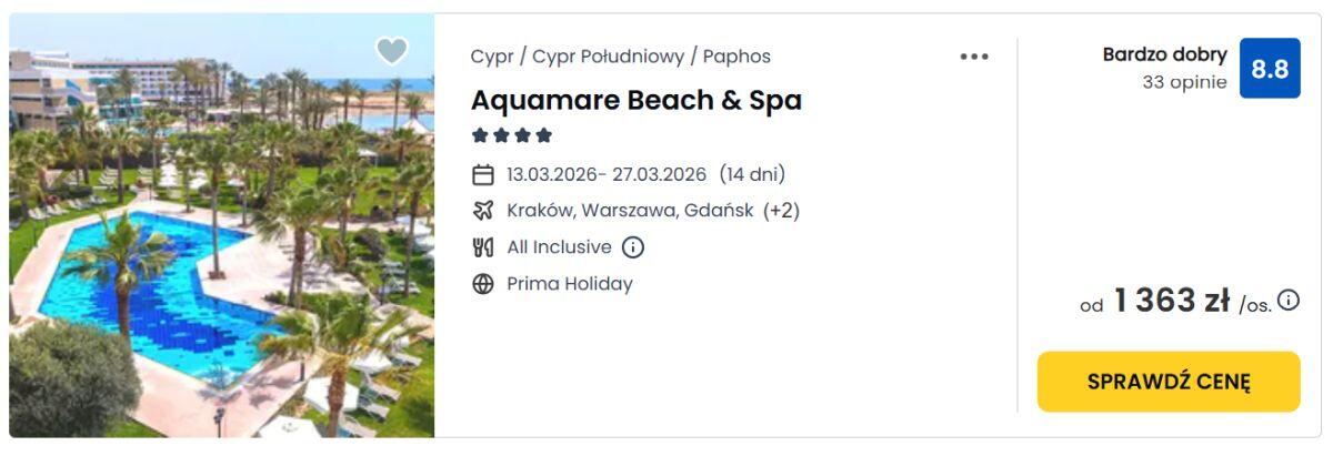 Dłuższe wczasy All inclusive w dobrej cenie - spędźcie 14 dni na Cyprze w bardzo dobrze ocenianym (8,8/10 na Wakacje.pl i 8,4/10 na Booking.com) 4* hotelu Aquamare Beach & Spa z All inclusive. Hotel leży przy plaży w miejscowości Pafos, oferuje m.in.: 2 baseny (w tym basen wewnętrzny), centrum spa, zajęcia sportowe, 2 restauracje, 3 bary, dostęp do Wi-Fi.