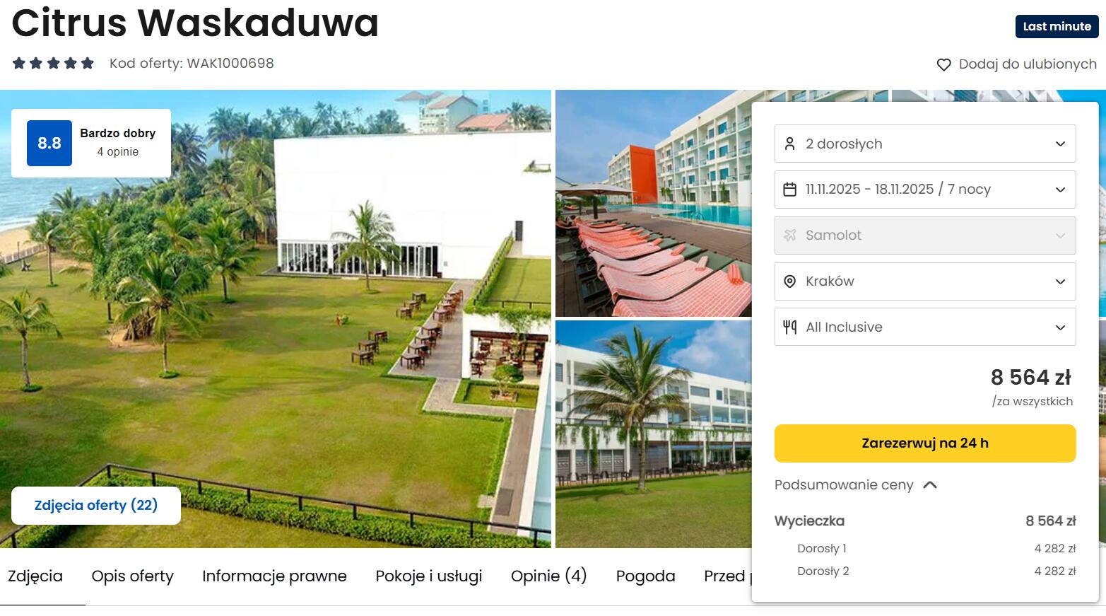 Goście chwalą 5* hotel Citrus Waskaduwa za jego doskonałe położenie bezpośrednio przy szerokiej, piaszczystej plaży nad Oceanem Indyjskim, w spokojnej okolicy Waskaduwa, niedaleko Kalutary. Hotel wyróżnia się nowoczesnym stylem, eleganckim wystrojem i wysokim standardem obsługi. Otoczony palmami i egzotyczną roślinnością, stanowi idealne miejsce na egzotyczne wakacje na Sri Lance z All inclusive – z dala od zgiełku, w rytmie szumu fal i ciepłego oceanu. Goście podkreślają wyjątkową gościnność personelu oraz wspaniałą atmosferę, w której luksus łączy się z naturalnym pięknem wyspy.