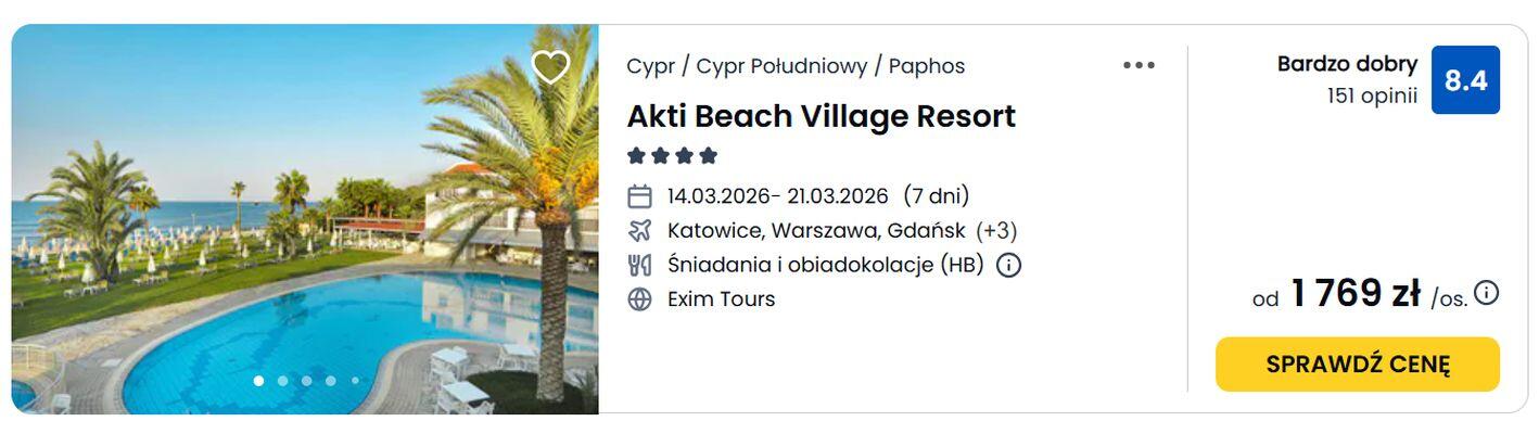 Cypr to jedno z tych państw gdzie można w bardzo dobry sposób połączyć odpoczynek ze zwiedzaniem - w tej propozycji tydzień urlopu spędzisz w komfortowym 4* hotelu Akti Beach Village Resort z wyżywieniem HB. Hotel położony jest nad morzem w Pafos, oferuje m.in. 2 baseny otwarte, podgrzewany basen kryty, restaurację, 2 bary, program animacyjny, wieczorne show. Goście bardzo pozytywnie oceniają hotel, wystawiając mu oceny 8,6/10 na Booking.com i 4,5/5 na Google.com.