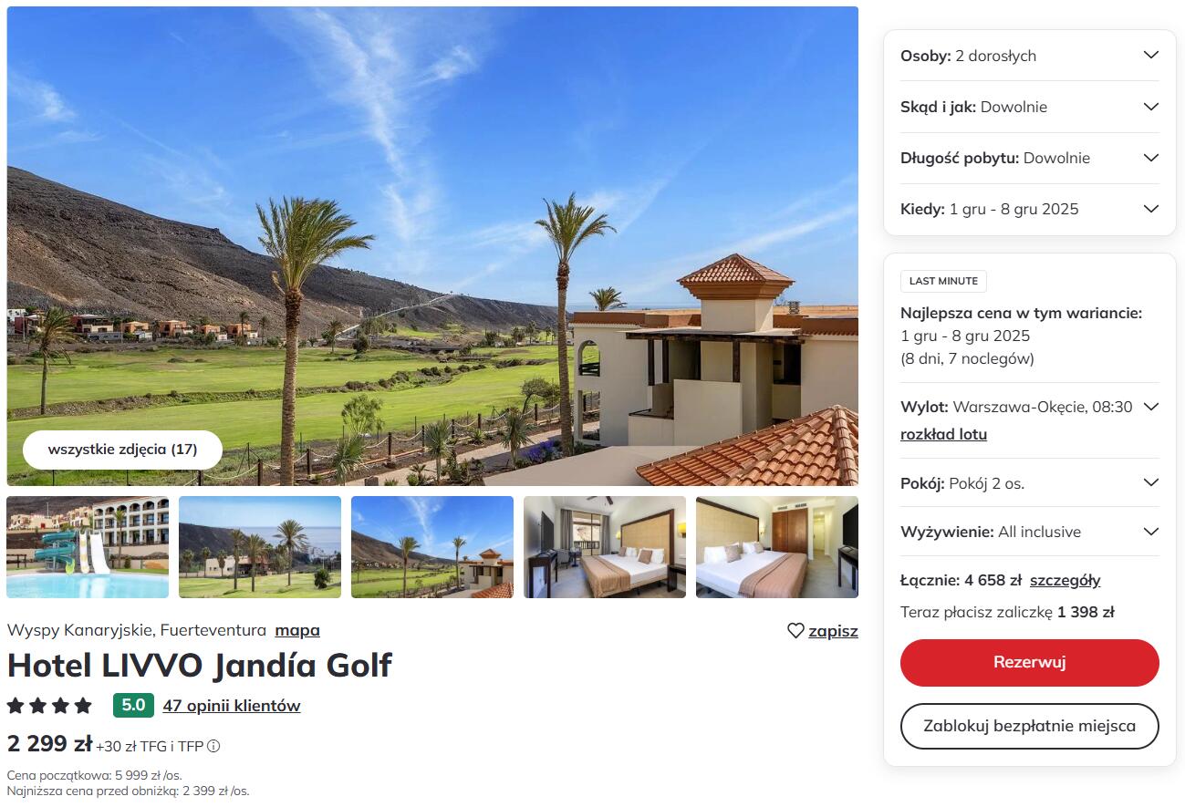 Ucieknij przed zimnem na Wyspy Kanaryjskie, tydzień urlopu z wyżywieniem All inclusive spędzisz na Fuerteventurze w dobrze przyjętym przez gości 4* hotelu LIVVO Jandía Golf. W hotelu znajdziesz m.in.: 3 baseny (w tym jeden podgrzewany i brodzik dla dzieci), animacje dla dzieci i dorosłych, zajęcia sportowo-rekreacyjne, bezpłatne Wi-Fi, 2 restauracje, 2 bary. Cena obejmuje kompletną wycieczkę z bagażem rejestrowanym. Ocena hotelu przez gości, to 8,3/10 na Booking.com i 5/6 na Itaka.pl.