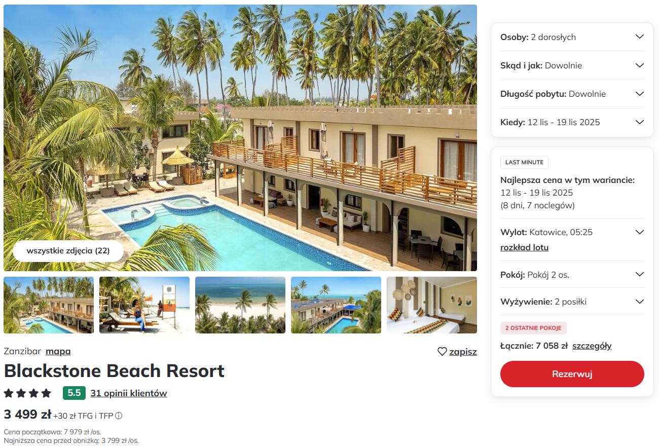 Na Zanzibarze każdy dzień zaczyna się od szumu fal i kończy pod gwiazdami na białym piasku - odpocznij w pachnącym nowością, bardzo dobrze ocenianym 4* hotelu Blackstone Beach Resort z wyżywieniem w formie śniadań i obiadokolacji. Hotel został oddany do użytku w 2024 roku, znajdziesz w nim między innymi: basen, jacuzzi, bezpłatne Wi-Fi, restaurację, bar, kawiarnię. Opinie gości o hotelu są znakomite, został oceniony aż na 4,8/5 na Tripadvisor.com i 10/10 na Booking.com. W cenie zawarta jest kompletna wycieczka.