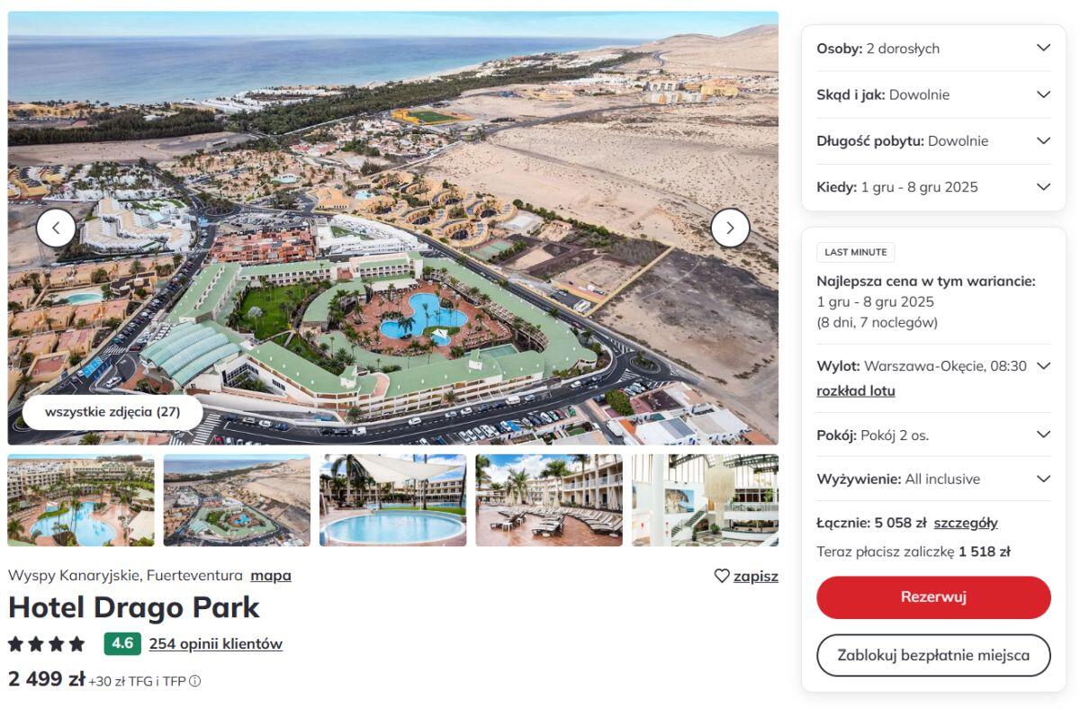 Odkryj Fuerteventurę, wyspę zjawiskowych plaż i wiecznej wiosny, która oferuje idealne warunki do wypoczynku. Tygodniowe wakacje spędzisz w dobrze przyjętym przez gości (ocena 8,2/10 na Bookingu) 4* hotelu Drago Park z All inclusive. W hotelu będziesz mógł skorzystać między innymi z 2 podgrzewanych basenów (w tym z jednego dla dzieci, animacje dla dzieci i dorosłych, dyskoteki, restauracji i kilku barów. Tytułowa cena zawiera kompletną wycieczkę z bagażem rejestrowanym.