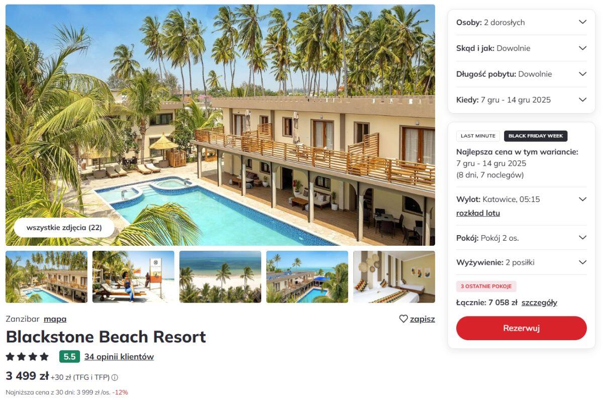 Podsumowując, Blackstone Beach Resort to naszym zdaniem dobre miejsce na spokojny wypoczynek w zanzibarskim klimacie, z naturalną plażą, pięknymi widokami i wygodą formuły HB. Drobne minusy mogą dotyczyć dłuższego transferu z lotniska oraz kameralnego charakteru infrastruktury, ale całość rekompensuje piękna okolica, ciepła atmosfera i wyjątkowe otoczenie Oceanu Indyjskiego – to doskonały wybór na wakacje na Zanzibarze.