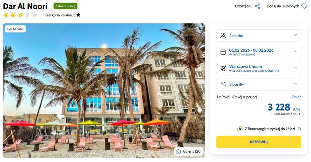 Odkryj magię orientalnego Omanu w Salalah, gdzie białe plaże spotykają się ze szmaragdową wodą Morza Arabskiego. Tygodniową przygodę spędzisz w komfortowym, bardzo dobrze ocenianym (5,4/6 na R.pl) 3* hotelu Dar Al Noori z pełnym wyżywieniem (3 posiłki). Hotel oferuje kameralny wypoczynek (tylko 32 pokoje) oraz lokalizację tuż przy plaży. Cena obejmuje bagaż rejestrowany.