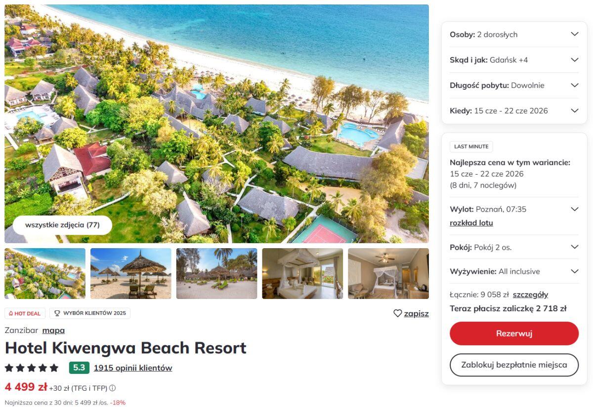 Znajdź miejsce, gdzie biały piasek przypomina mąkę, a woda ma kolor intensywnego turkusu. W tej propozycji proponujemy egzotyczne wakacje na Zanzibarze w 5* Kiwengwa Beach Resort z wyżywieniem All Inclusive. To jeden z tych hoteli, który idealnie łączy afrykański styl makuti z europejskim komfortem. Położony bezpośrednio przy jednej z piękniejszych plaż wschodniego wybrzeża, pozwala poczuć egzotykę bez rezygnowania z wygód, oferując relaks w cieniu palm kokosowych.